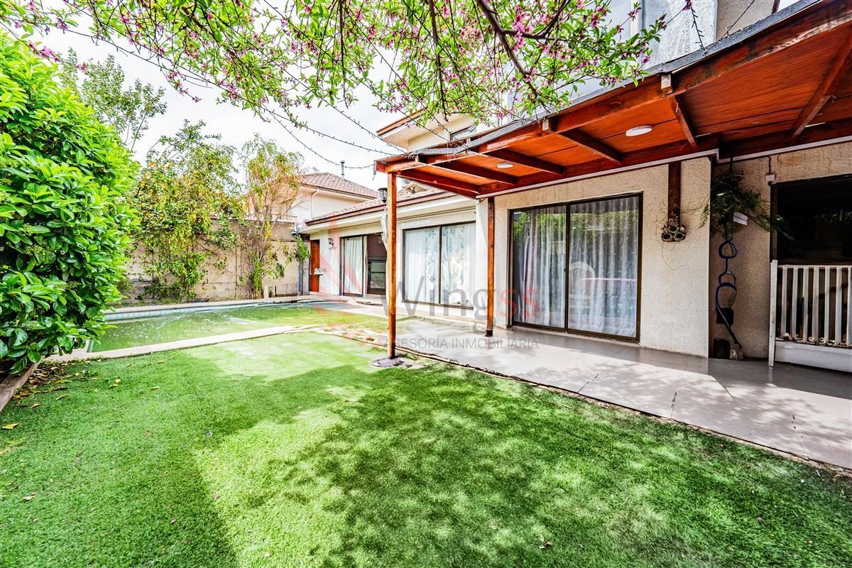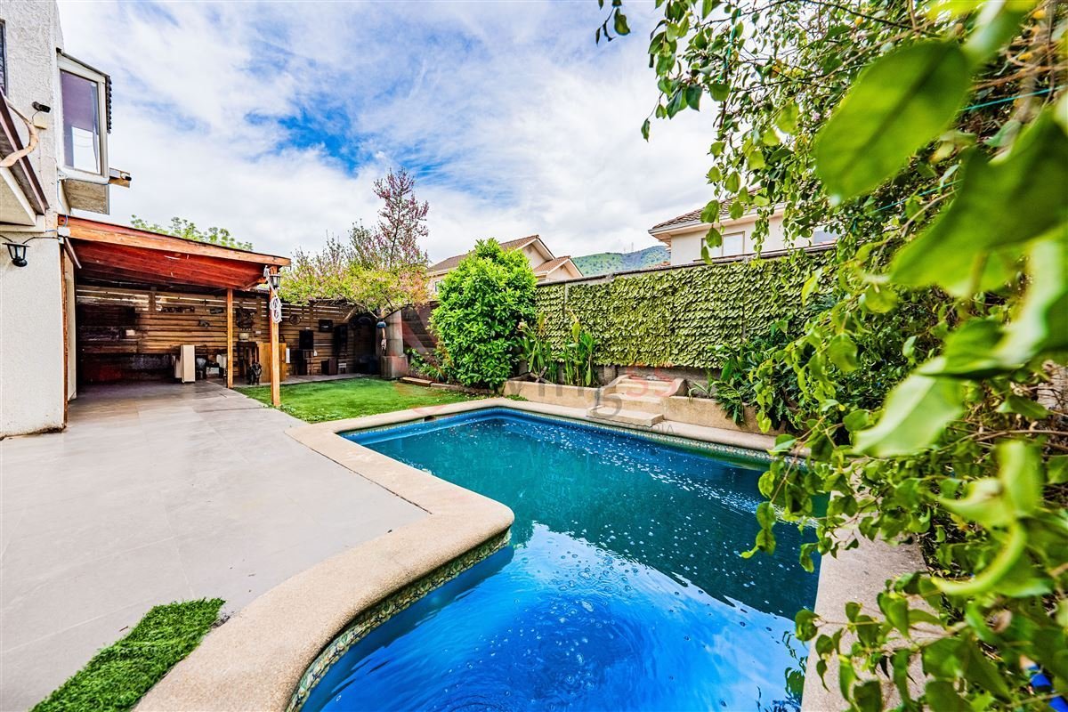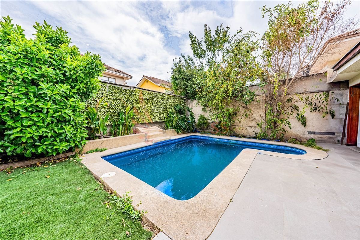 Amplio patio con una fantástica piscina que recibe luz solar durante todo el día, junto a una terraza con quincho, ideal para relajarse o divertirse en familia.