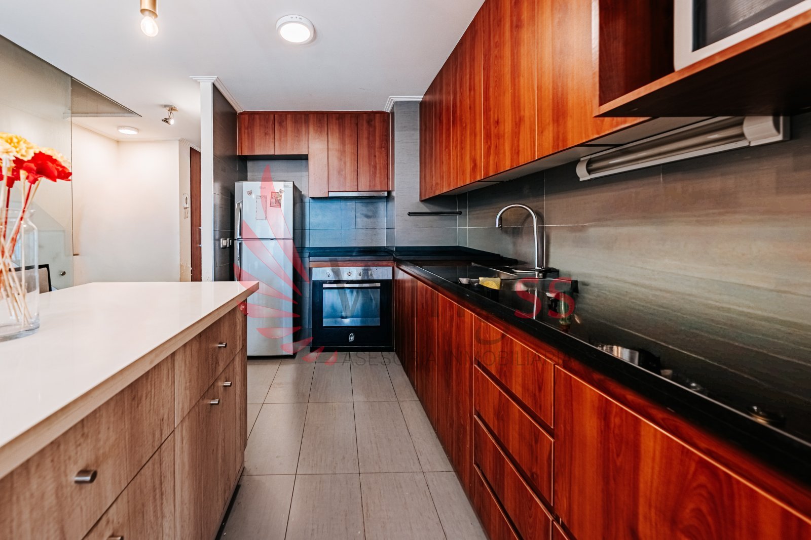 Moderna cocina integrada con isla empotrada, gran capacidad de almacenamiento y excelente funcionalidad.